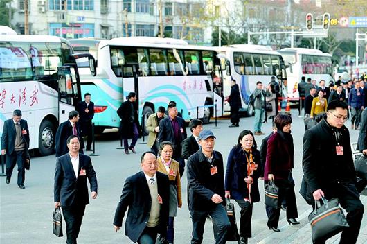 湖北日报讯 图为:昨日,参会人员集体乘坐大巴抵达会议现场。当日,省十二届人大五次会议在洪山礼堂开幕。 (全媒体记者 倪娜 摄)