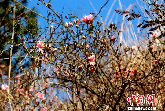 近日,在湖北省孝感市孝昌县一山谷中,一株株野生杜鹃花悄然绽放。阳光洒下,一抹抹红色令人赏心悦目,为山谷增添了一抹亮丽的春色。据了解,春杜鹃花期一般在4—5月,而此处位于山谷地带,东西两边被高山峭壁包围,且山谷下有一水库,气候潮湿温暖,导致杜鹃花提前开放。