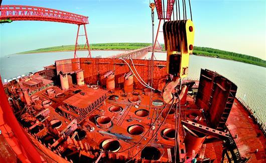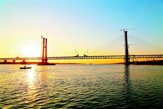 图为2015年12月蒙西华中铁路荆州长江公铁两用特大桥实现主桥顺利贯通。