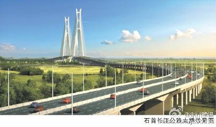 石首长江公路大桥项目起自荆州市江陵县普济镇西,接在建的潜江至石首高速公路,经横沟市镇,在北碾子村附近跨越长江,至石首市高基庙镇西与已建成的江南高速连接,线路全长39.723公里,概算总投资金额75.23亿元。全线采用高速公路标准建设,设计速度为100公里/小时,大部分采用双向六车道标准。