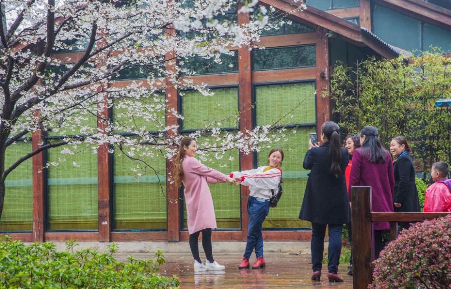 三月细雨沥沥,园内樱花正值盛放时节,或洁白如雪、或粉嫩妖娆,满园云蒸霞蔚。微风吹来,花枝摇曳,落英缤纷,波泛幽香。徐徐春风中,让人流连忘返。