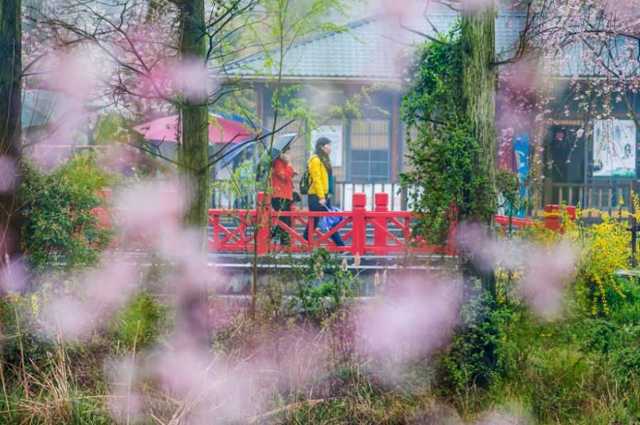 园内和风浓郁,虹桥、叠水、置石相映成趣,樱花在日式园林中散发出一番古典雅致的味道。
