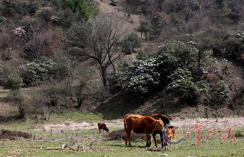 继续前行,视线顿时豁然开朗,一个足球场大小、约有3000平方米的草坪出现在眼前,这个坪村民们叫它如意坪。坪的后方是一字排开的三个山头,仿佛刘关张三兄弟行军打仗路过此坪,在这饮马休息。坐在草坪上,欣赏着对面的连片杜鹃,只见白色的云锦杜鹃纯洁透亮,红色的云锦杜鹃鲜艳欲滴,它们在层层叠叠的绿叶的衬托下显得格外娇艳。