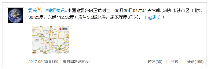 5月30日电 中国地震台网正式测定:5月30日1时41分在湖北荆州市沙市区(北纬30.23度,东经112.32度)发生3.5级地震,震源深度8千米。