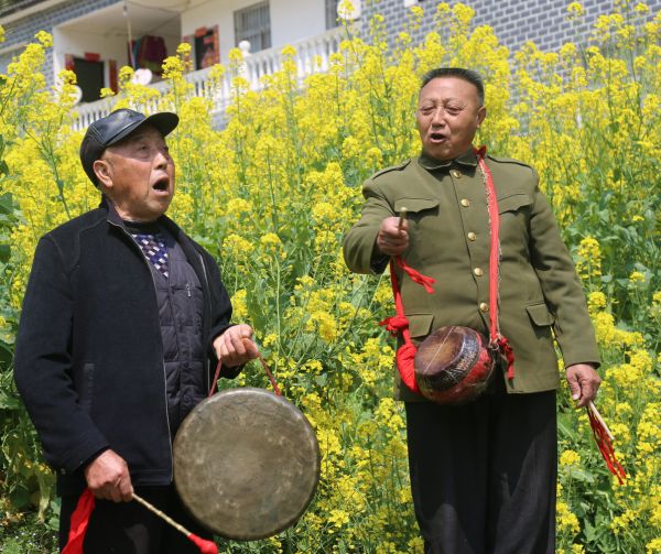 树树桃花遍地红……”在锣与鼓的伴奏下,独具乡土韵味的山歌铿锵激扬,飘过金灿灿的油菜,越过绿油油的茶园,透过红艳艳的桃枝,回荡在荆山深处的小村庄。