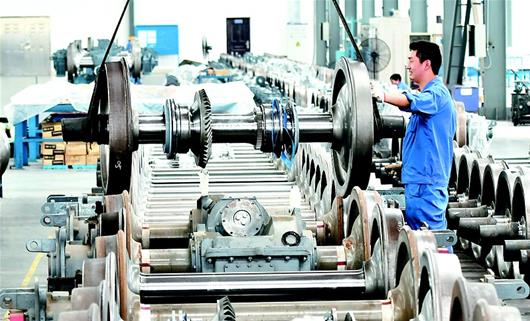 图为:襄州湖北威能达传动有限责任公司生产车间内一派繁忙景象,该公司为铁路工程机械生产的专业列车车轮等待发运。(记者刘曙松 视界网沈君 摄)