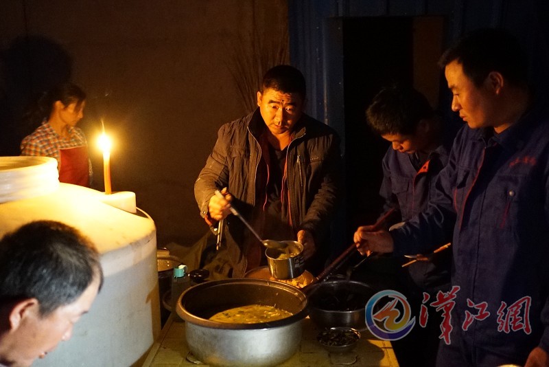 停电了,工人们点着蜡烛吃早饭