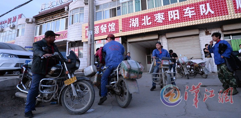 等工友们匆忙吃完早餐,就要陆续开始一天的工作了。凌晨5时许,在一通接着一通的电话联系后,工友们骑上摩托车或两人一组,或四人一伙,直奔各个物流货场投入到了一天紧张而又忙碌的工作。