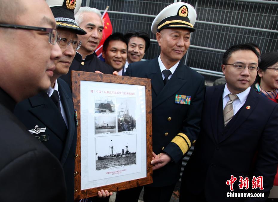 10月3日,中国海军第26批护航舰队抵达英国伦敦访问,这是中国海军舰队首次到访英国首都伦敦。图为英国北部华人企业家协会向舰队指挥长王仲才少将(中)赠送清朝晚期在英国纽卡斯尔制造的致远号、靖远号、超勇号和杨威号四艘战舰图片辑,表达“不忘国耻、富国强军”的愿望。 中新社记者 张平 摄
