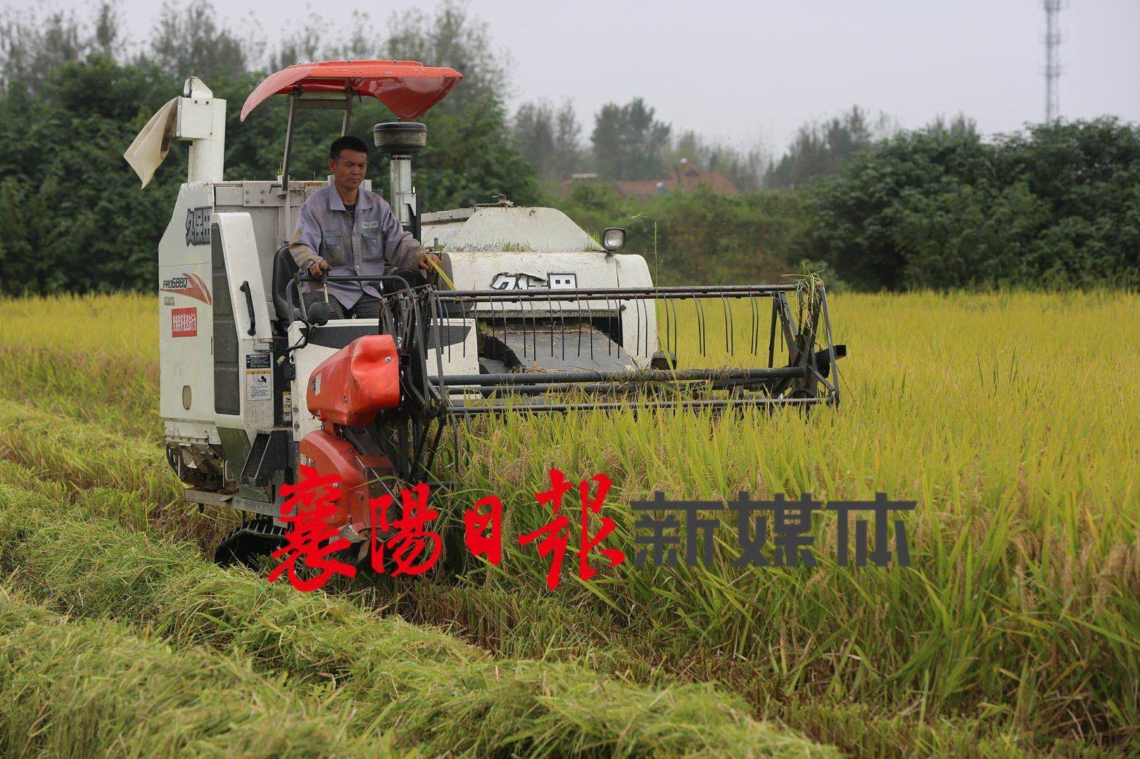 在杨旗营村一块地势较高的稻田里,积水已经逐渐散去,村里的农机手王德全正开着收割机抢收稻谷。由于稻苗含水量高,收割时经常卡住机器,收割一段时间,王德全就要清理一遍机器。
