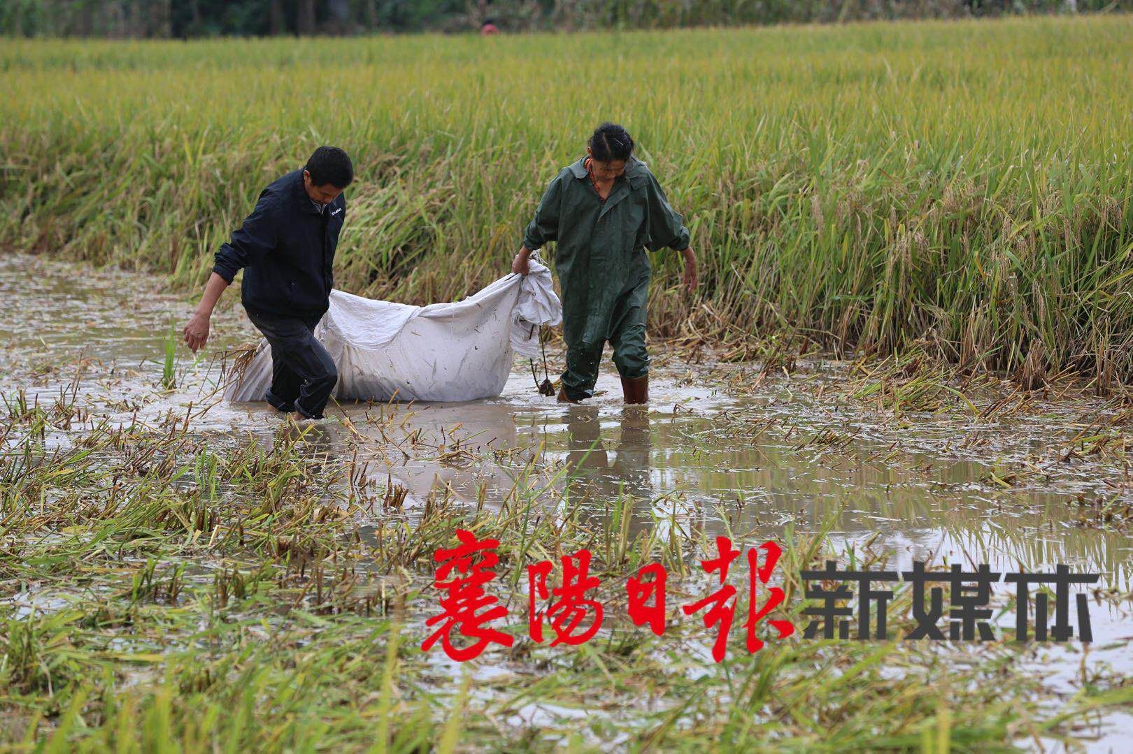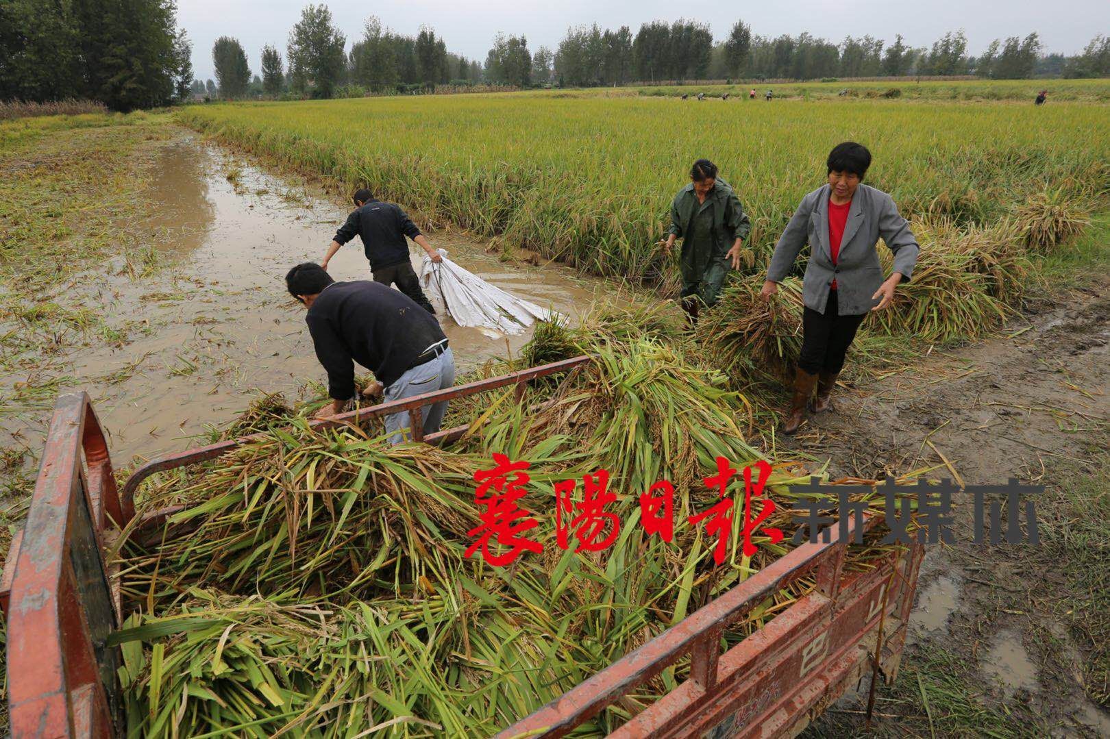 10月6日,樊城区太平店镇杨旗营村,农户们趁着雨后抢收受灾的稻谷。