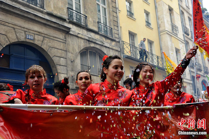 一群法国姑娘穿着唐装,兴高采烈的参加春节游行,喜感满满。