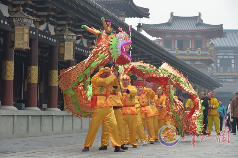 正月初二,民间艺人在唐城景区表演民俗节目。 全媒体记者 丁涛 通讯员 宋萌 摄