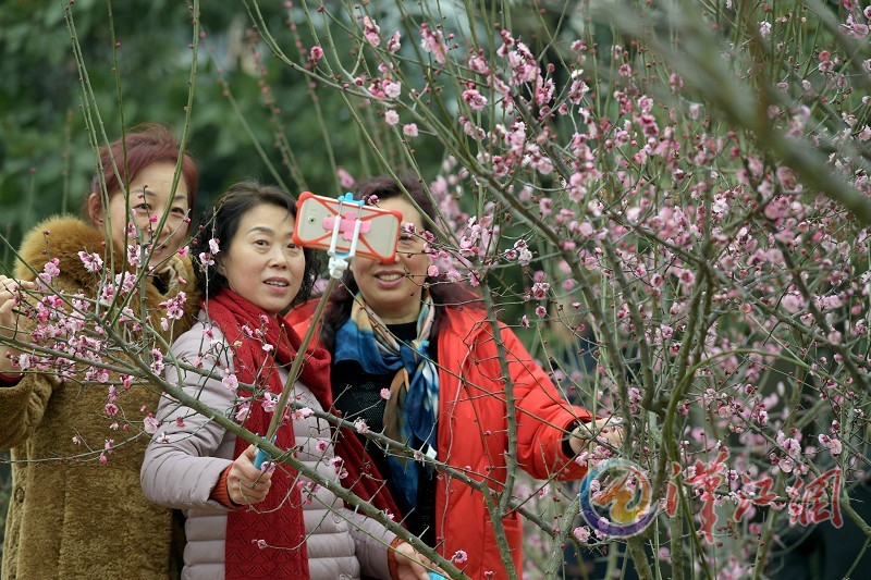 2月17日,万山梅花园内游人赏花迎春。 全媒体记者 安富斌 摄