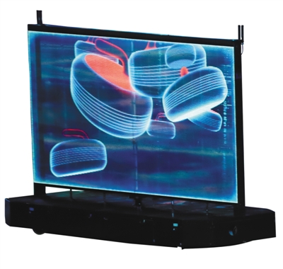 机器人身上装载的大屏幕使表演十分炫酷,移动的机器人,流动的画面形成多层次,递进式现场效果。为了体现冰雪主题,24块大屏幕打造成了像冰雪一样效果的“冰屏”(雪花洁白、冰花透明),实现透明图像显示,效果更逼真,更灵动。每块“冰屏”长3米,中间没有横梁,背后卡槽与屏幕之间的距离,可以用微米计算。此外,所有屏幕经过了风洞和冷库测试,达到风速每秒15米的要求。