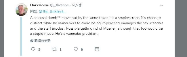 最近,美国政府高官走马灯式的替换,让外界猜测特朗普领导下的白宫陷入一片混乱。有网友称,特朗普此次对华开展贸易战,旨在混淆视听,转移民众视线。还有网友表示,特朗普的作风一贯我行我素,根本不考虑普通老百姓或是穷人的利益,美国的物价可能会随着贸易战的打响水涨船高,随之而来的是美国人的生活水平受到严重影响。
