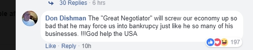 网友Don Dishman说:“‘伟大的谈判家’正在毁掉我们的经济,他会让我们都破产的,就像他自己的许多企业那样。”