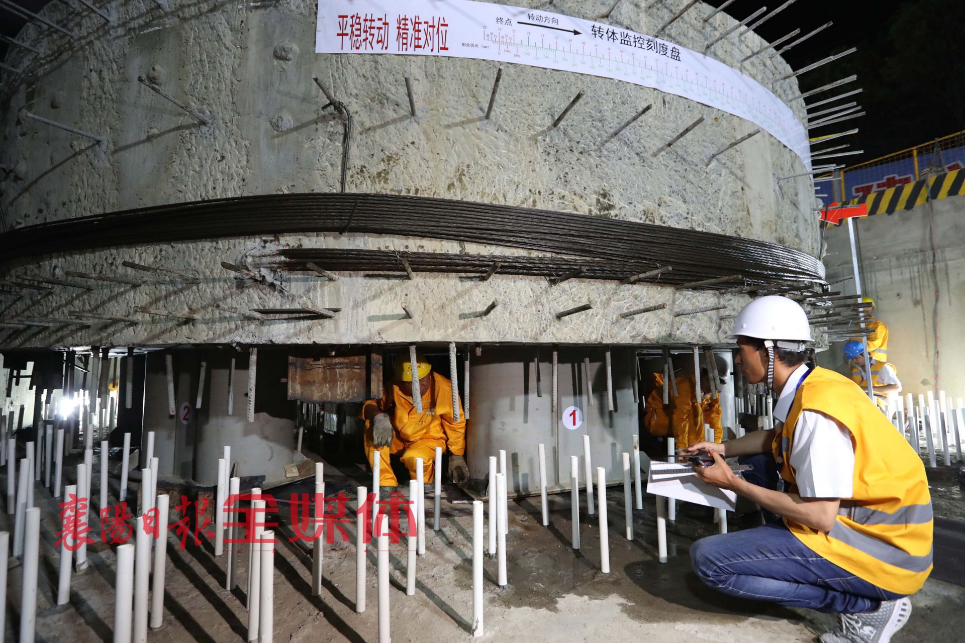 汉丹铁路是我国较为繁忙的铁路干线,为动车、客货线路,平均每5分钟就有一趟列车通过。转体梁与汉丹铁路线最近距离仅7.5米,施工难度大,安全风险高。为保证线路正常运营,转体梁将选在没有列车通行的凌晨进行,在有效的120分钟分钟“天窗点”内,用时82分钟完成转体连续梁。