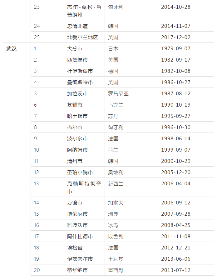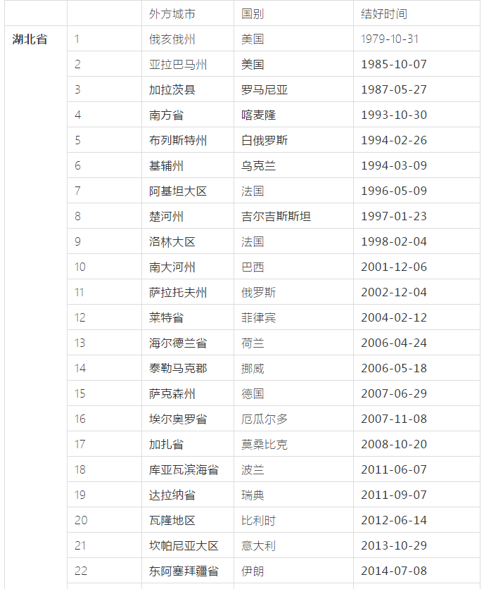 1979年以来,湖北建立的94对友好城市关系中,湖北省25对,武汉市26对,还有其他市州的19个城市共结交了43个“洋朋友”。