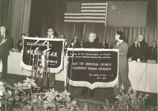 1979年10月31日湖北省和美国俄亥俄州正式签署建立友好省州关系协议,时任湖北省革命委员会主任陈丕显与俄亥俄州参议院主席麦歇尔(Harry Meshel)互赠锦旗。
