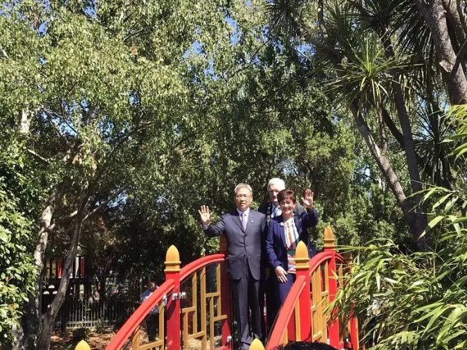 12月2日,一座湖北参与捐建的红色“友谊桥”,架在了路易·艾黎家乡——新西兰南岛胡鲁努伊区安伯利镇的一条溪流上。新西兰总督帕齐·雷迪、中国驻基督城总领馆总领事汪志坚与来自湖北的大学生,共同为友谊桥揭幕。
