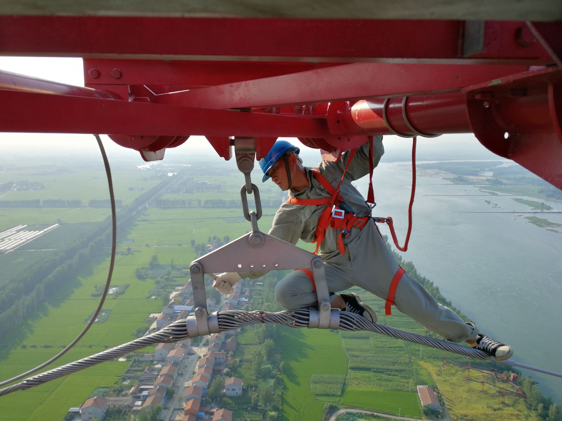 为保证高温大负荷期间电网安全运行及电力可靠供应,7月20日,国网襄阳供电公司检修分公司带电班工作人员张勇波顶着烈日爬上182米的220千伏樊蜡线80号塔,处理避雷线悬挂点差缺螺帽的缺陷。