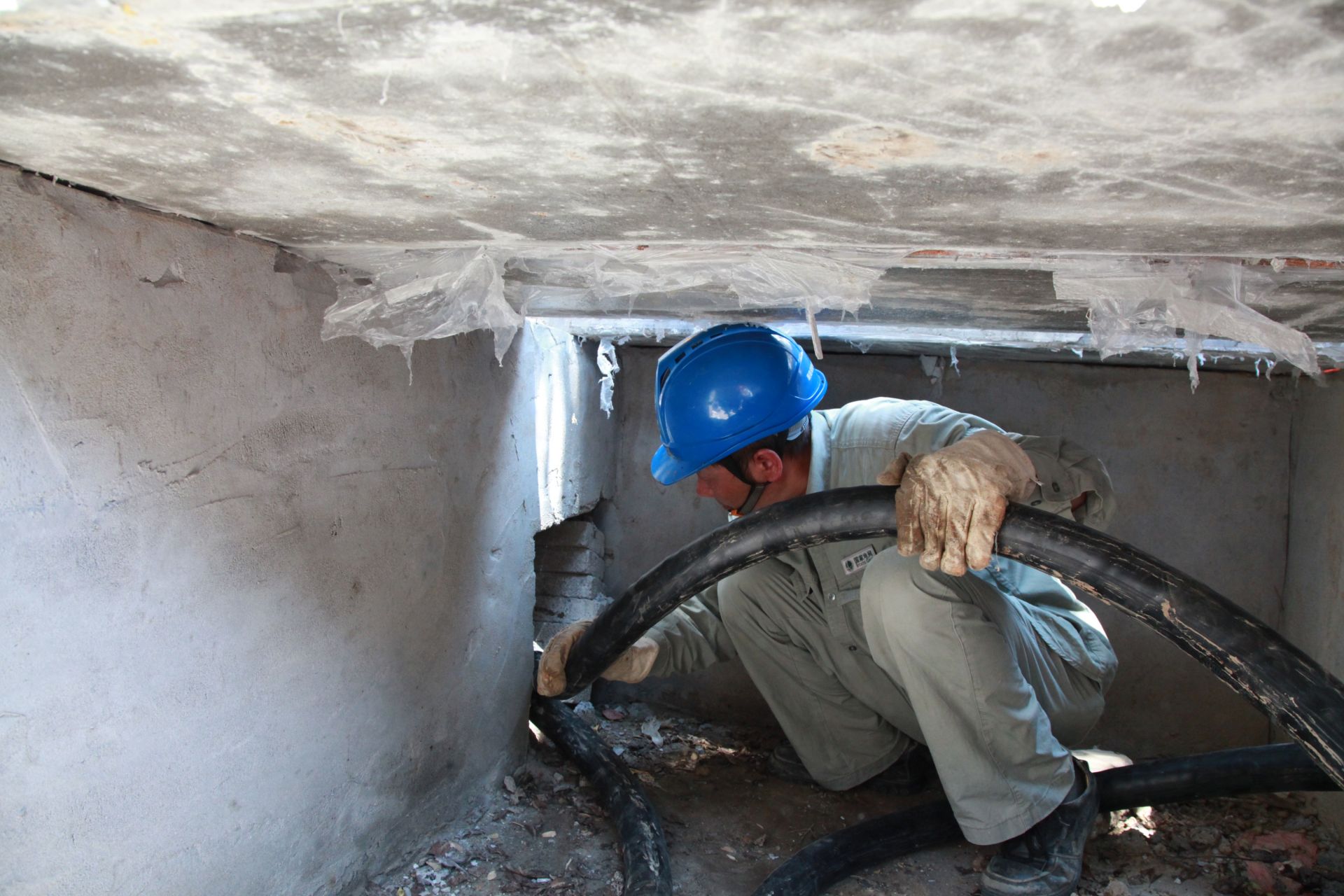 7月24日,襄阳供电公司泽能分公司员工在江山重工军工厂馨园小区进行“三供一业”工程改造电缆展放工作,蹲在地下不足半米深的密不透风的电缆管沟内作业,一蹲就是一两个小时。