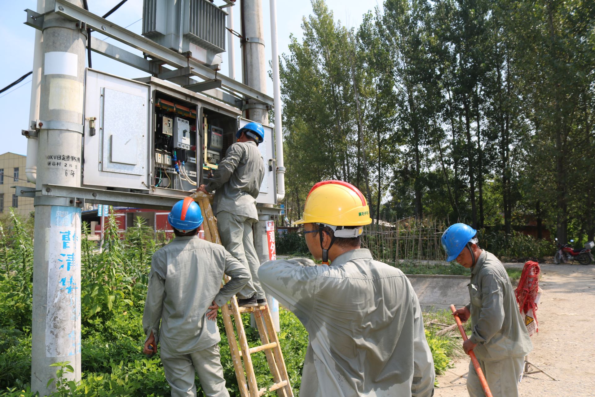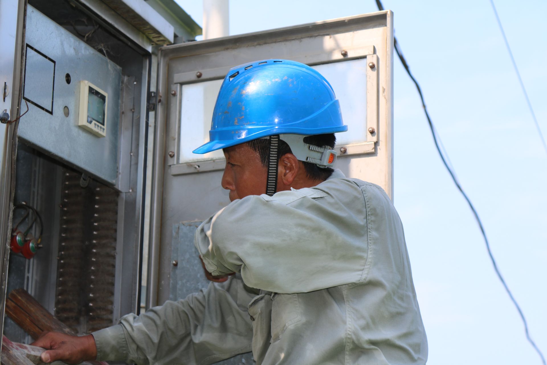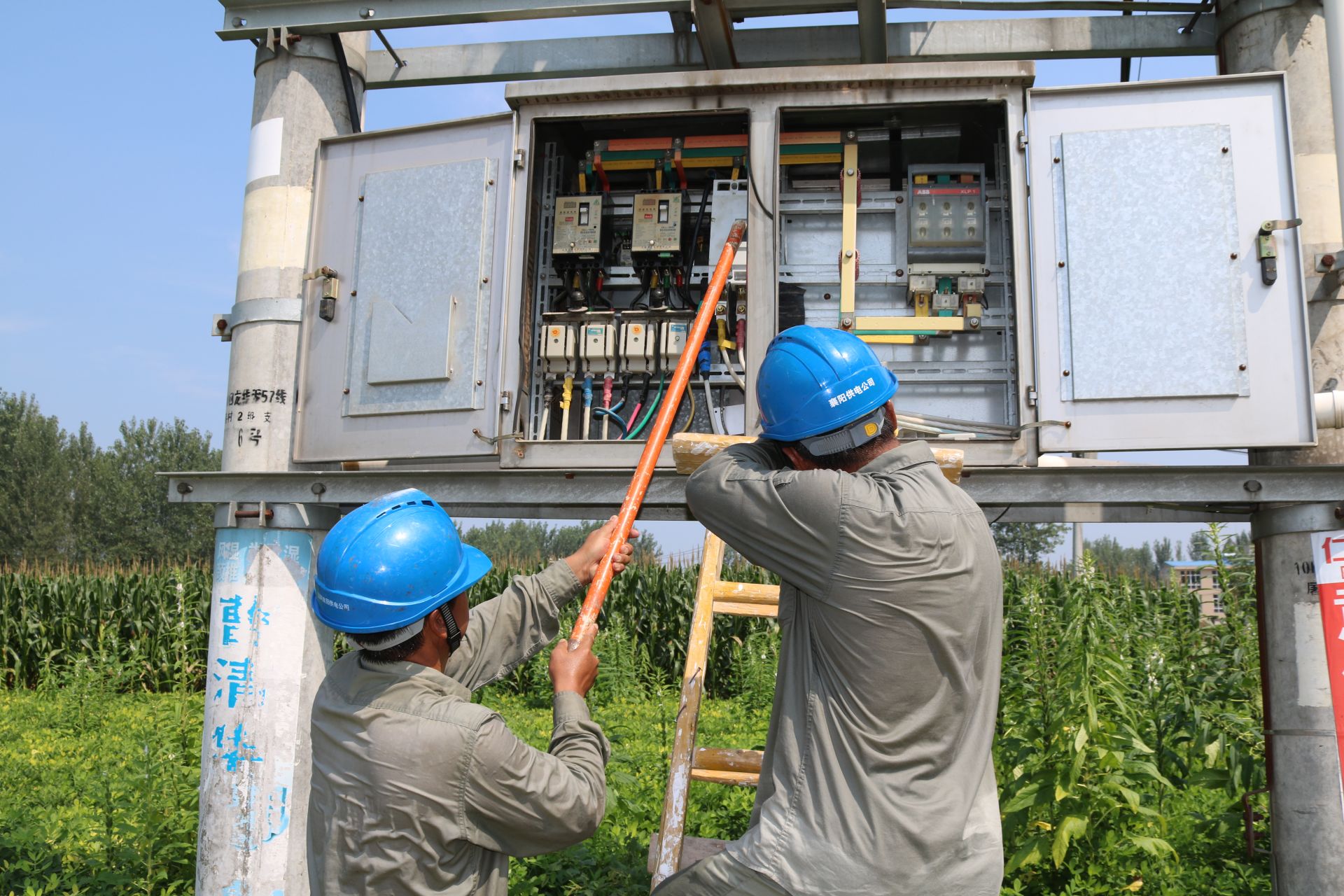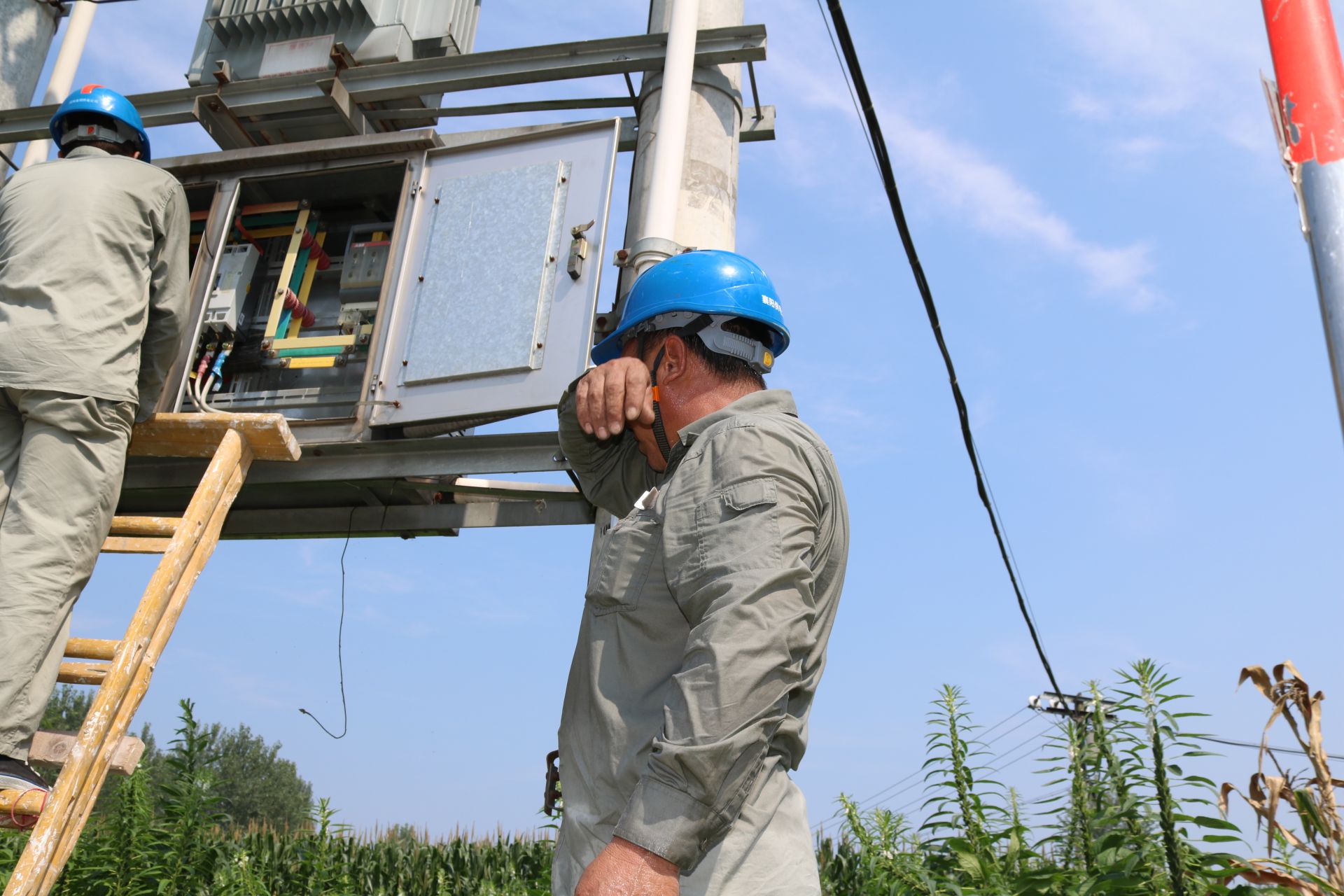 立秋时节,秋老虎持续发威。8月9日,国网襄阳供电公司客服襄城分中心卧龙供电所员工在10千伏回龙线屠巷村2组支6号杆控制箱前更换断路器。当天室外温度高达39℃度,站在太阳底下,汗水顺着脸颊、脖颈止不住的下,调皮的汗珠越过眉宇的防线钻进眼睛里,没办法,师傅们只好撸起袖子把汗擦。