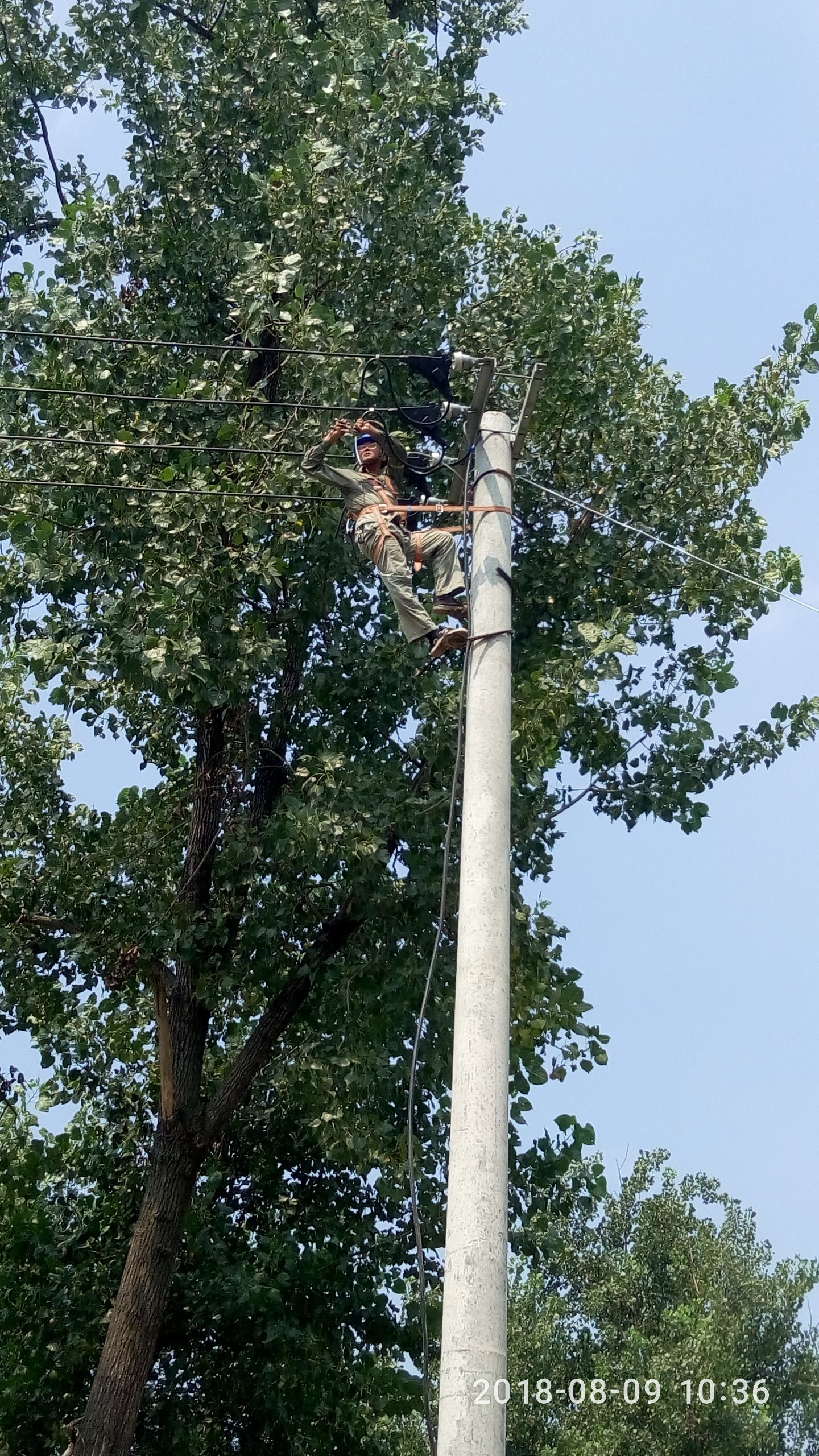8月9日10时36分,国网老河口市供电公司员工张雷在南刘岗5组为建房户安装临时用电。