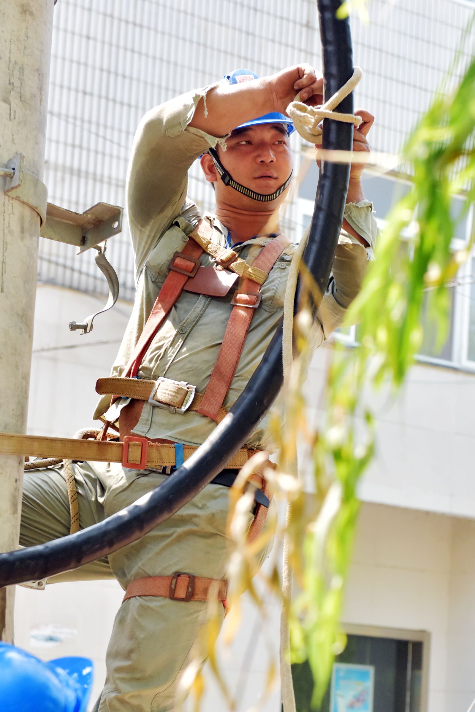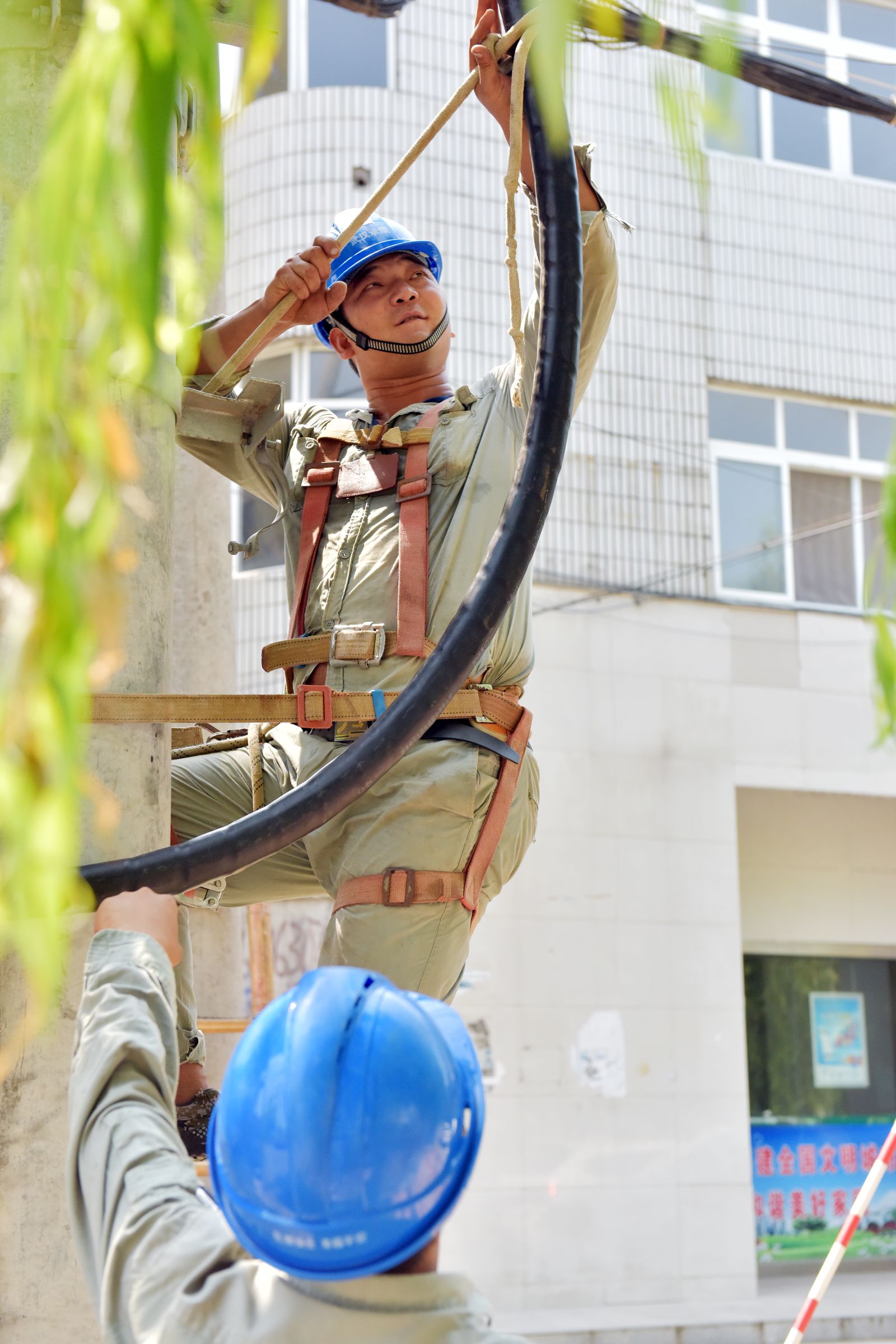 8月24日,老河口市供电公司施工人员对10千伏孟镇线孟55线路孟楼16号台区进行升级改造,解决孟楼镇孟楼村的用电卡口问题。图为施工人员在孟楼16号台区K2开关出线1号杆敷设电缆。