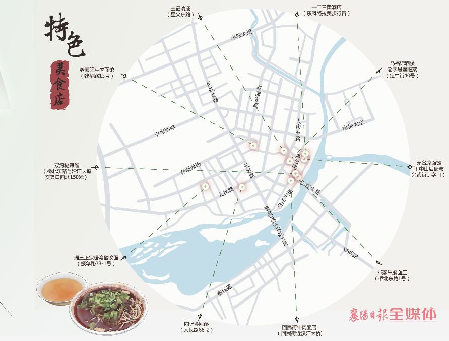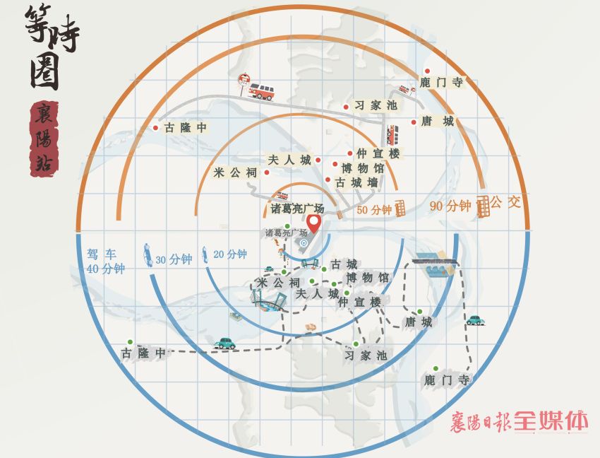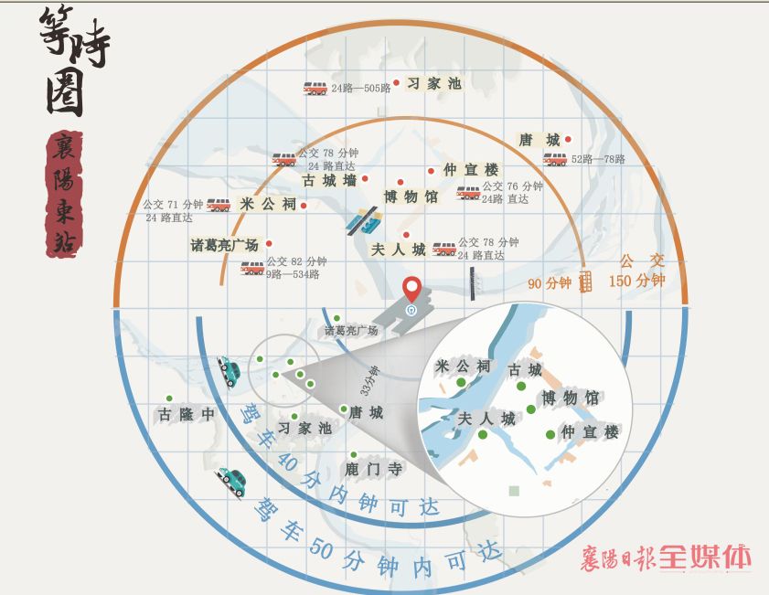 “黄色的部分是公交车到达时间、蓝色部分是开车时间。红圈标的公交90分钟,就是从这坐公交车大概是90分钟。”市测绘研究院副院长盛一楠说,新版地图突出了旅游元素,和此前地图不同的是,这次的旅游地图上,还标记了以襄阳站和襄阳东站两个火车站为起始点的旅游等时圈。