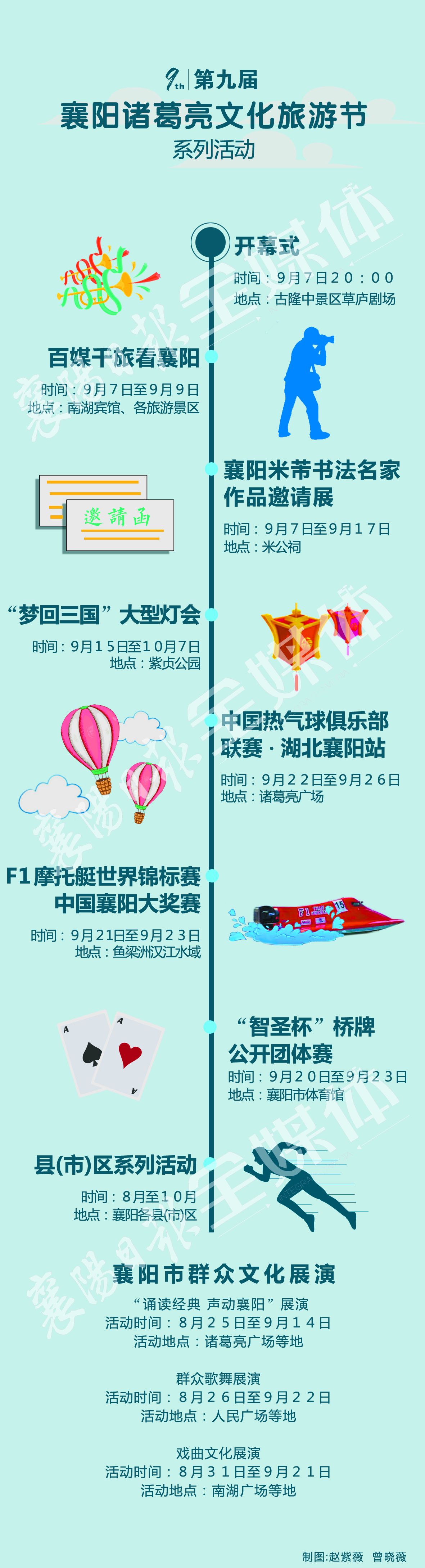 据介绍,本届襄阳诸葛亮文化旅游节活动多、档次高、规模大、持续时间长,包括开幕式文艺演出、中国襄阳米芾书法名家作品邀请展、“智圣杯”桥牌公开团体赛、F1摩托艇世界锦标赛、2018中国热气球俱乐部联赛襄阳站暨襄阳热气球梦想天空节、“百媒千旅看襄阳”、县(市)区系列活动等。从空中到陆地再到水域,精彩纷呈;从线上文化旅游节到线下购物狂欢节,互动体验不断,将是一次“文化旅游的盛会,襄阳人民的节日”。