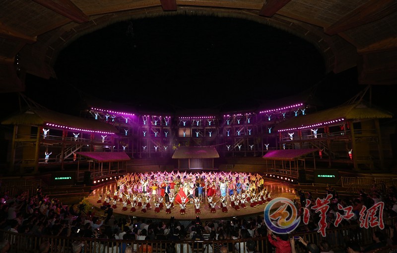 据了解,该剧场背面青山为屏,西、南两面毗邻大小两座湖泊。中央舞台直径80米,中间设“阴阳鱼”分割,呈太极图造型,暗合中国古代“天人合一”和“圆满”的哲学思想,同时力图还原当年诸葛草庐的情景。
