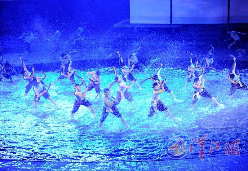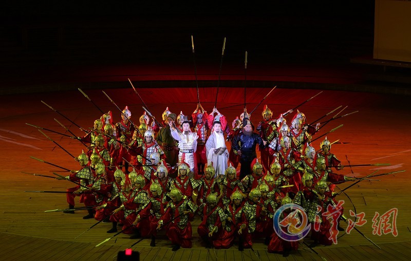 流水环绕、舟行其间,舞台背景中高低错落的每一组草庐建筑都随着圆弧移动,并组成一幅180度的巨大环幕。舞台上,在大场景歌舞和声光电效果中,襄阳博物馆珍藏的三国时期“华夏第一大铜马”昂首发出历史的嘶鸣,瞬间将观众的思绪带到烽火连天的三国战场……
