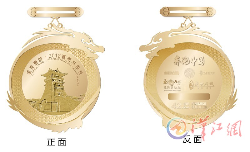 襄马完赛奖牌以唐城凯旋楼为主体元素,辅以祥云衬托、卧龙环绕,整体设计古色古香,尽显襄阳历史、人文的厚重。