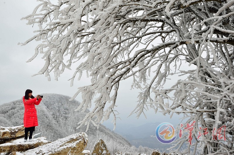 12月8日,游客在后坪镇横冲景区拍摄雾凇美景。近日,受强冷空气的影响,保康县后坪镇海拔1800多米的横冲景区出现雾凇美景,满山遍野银装素裹,吸引众多游客前来观赏。 通讯员 杨韬 张洪伟 摄