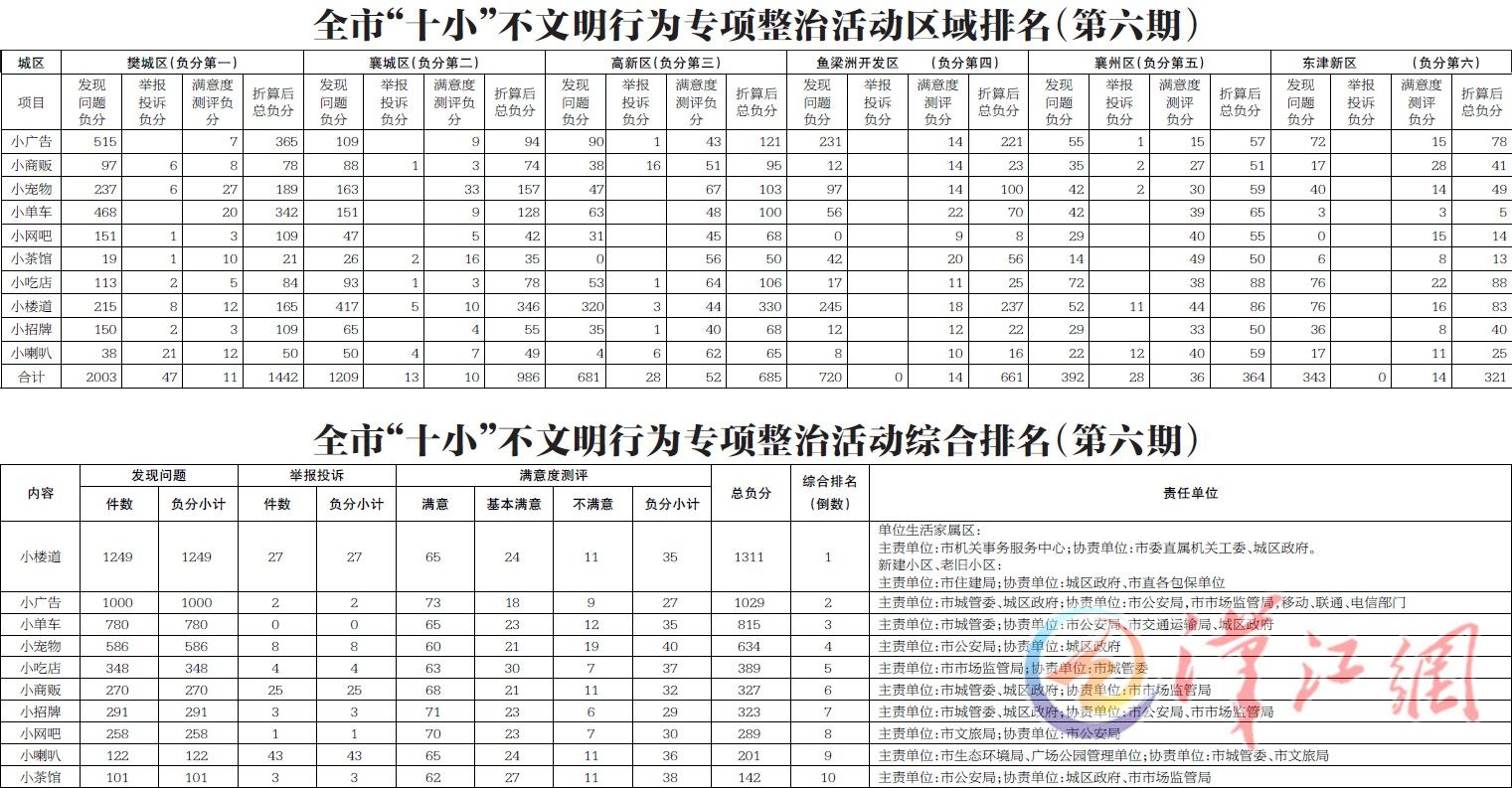 襄阳日报讯(通讯员曹帅 王晓光 全媒体记者孙修廷)9月5日,市创文办公布第六期全市“十小”不文明行为专项整治活动区域排名和全市“十小”不文明行为专项整治活动综合排名。记者发现,与前五期排名相比,“小楼道”问题依然最多,以总负分1311分名列榜首;第四期排名倒数第一的樊城区本期再次垫底。