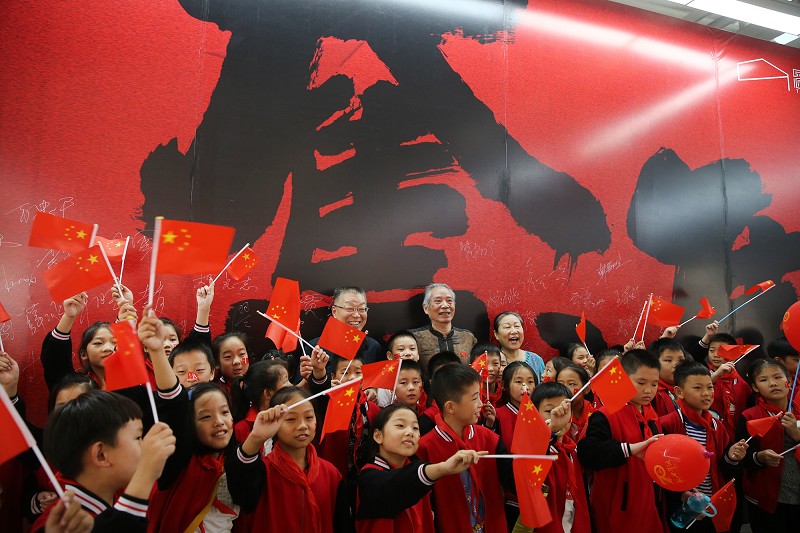 9月30日,在“奋进——涂廷多书法作品展”上,米公小学师生与书法家共同庆祝中华人民共和国成立70周年。 全媒体记者 安富斌 王虎 摄