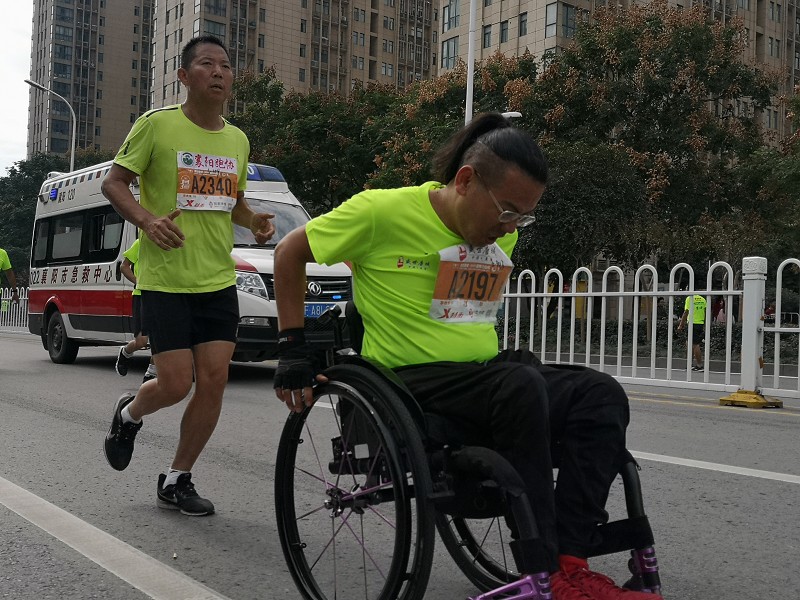 2019襄阳马拉松赛,“轮椅跑者”周伟再次出现在赛道上。这次,他要挑战“全马”。