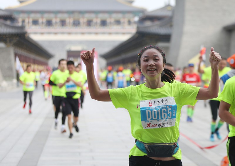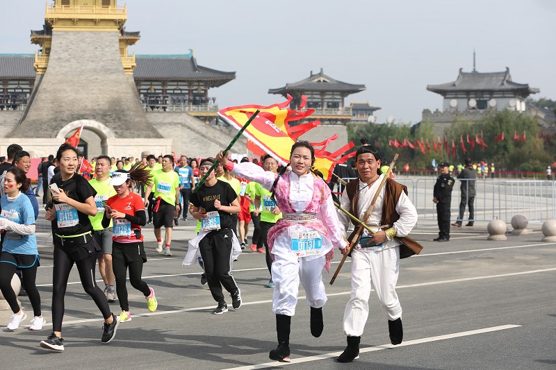 跑者身着古装,构成一道亮丽的风景线。 全媒体记者 李旭晖 摄