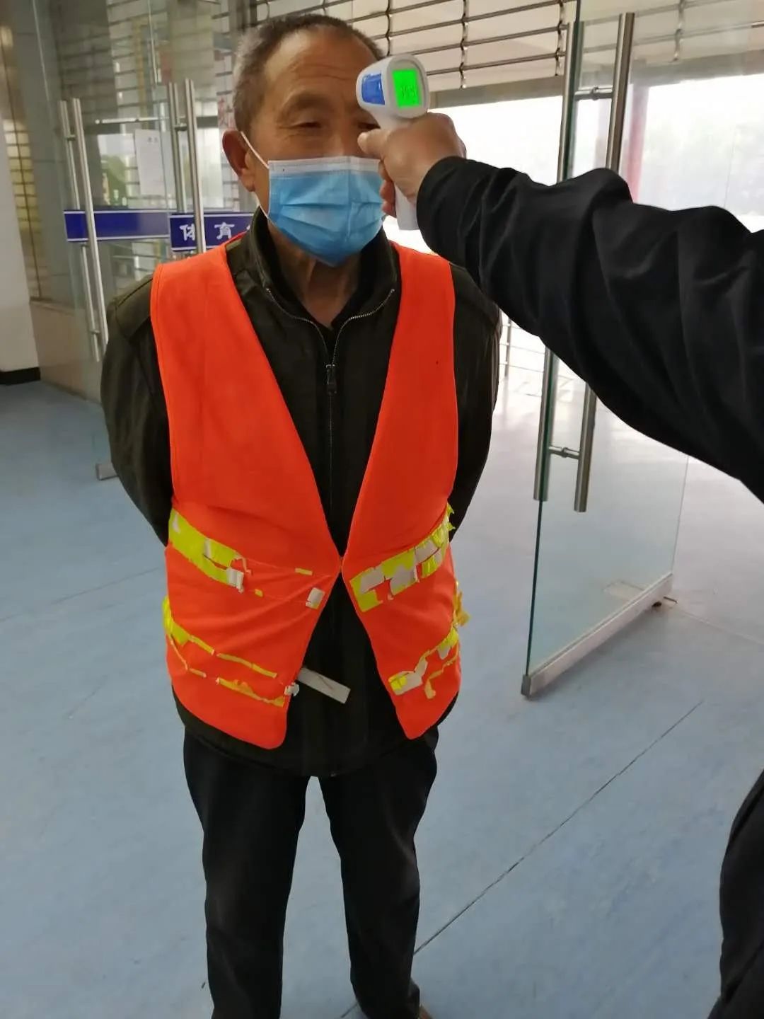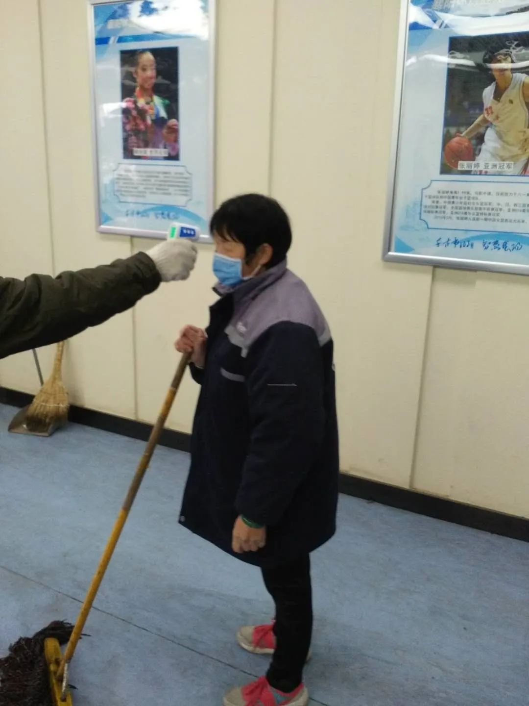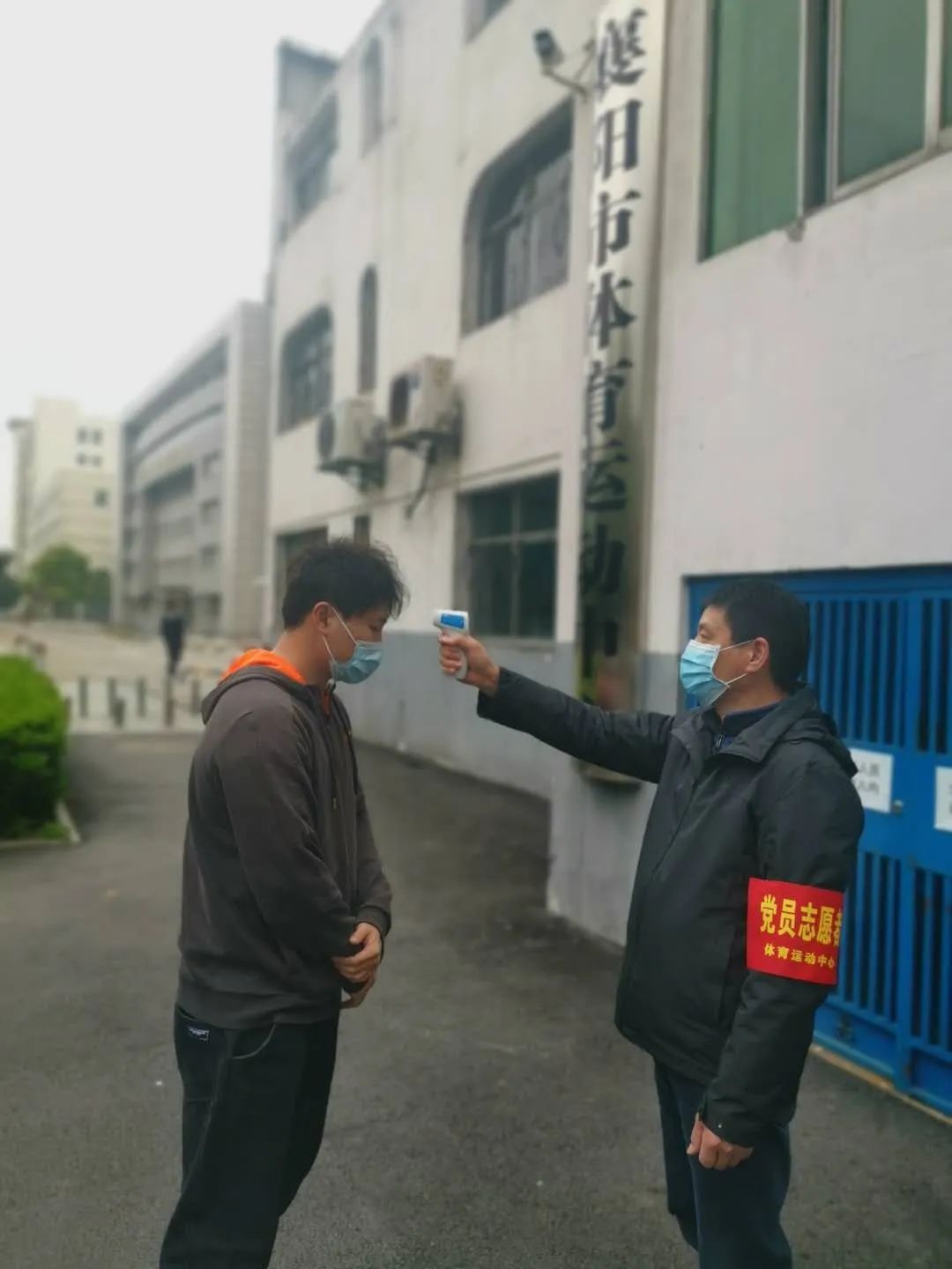 场馆工作人员进行体温检测