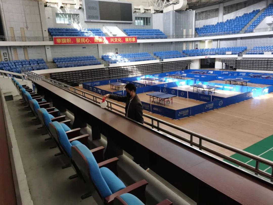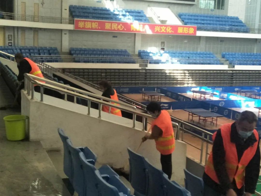 对场馆进行全方位、无死角的清理、消毒分工合作,有序进行