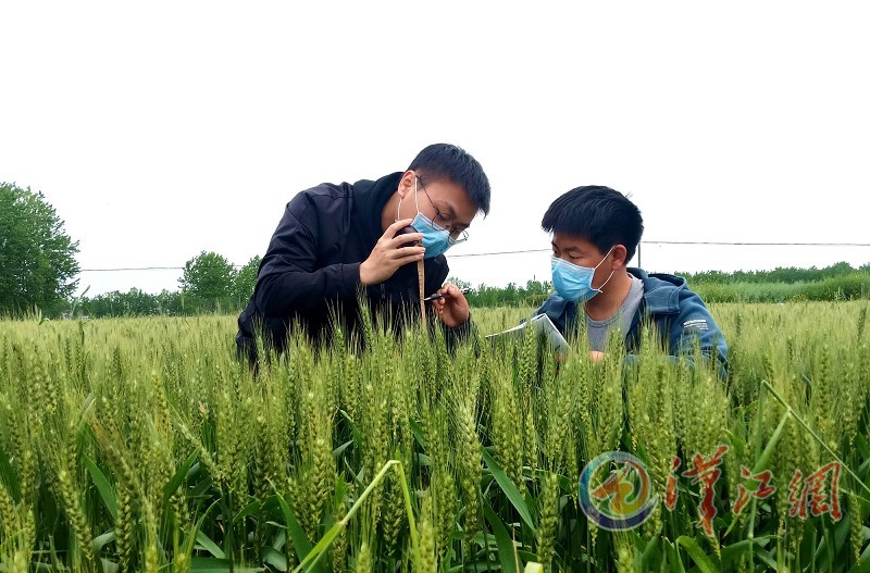 图为农业气象技术人员在冷集镇塔湾村现代高产农业示范田,现场研判今年小麦穗部发育状况,并对小麦亩穗数、穗粒数、千粒重等产量预报基础数据展开测量调查。