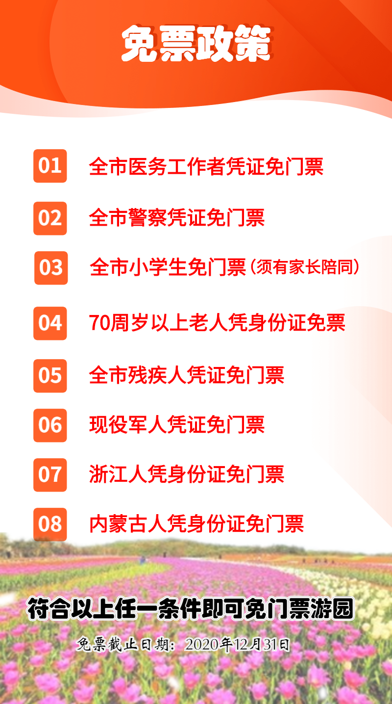 即日起,全市医务工作者、全市警察、全市小学生、70周岁以上老人、全市残疾人、现役军人,浙江及内蒙古户籍市民到圣境花谷景区旅游,凭证均可享受免票政策。