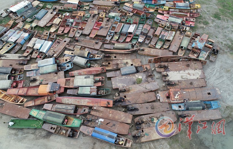 7月7日晚,樊城张王岗村汉江边的滩涂上,管理员封存牛首镇上岸的船只(无人机拍摄)。截至7月7日,全市禁渔水域有证渔船1114艘全部上岸,其中341艘已补偿到位;初步排查到的2290艘“三无”船舶已全部上岸。 全媒体记者王虎 李旭晖摄