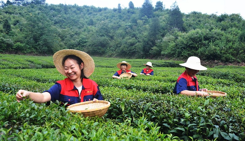 7月7日,谷城县五山镇杨家老湾村裕满春茶业有限公司茶叶基地里,脱贫茶农抢抓晴好天气采摘夏茶。