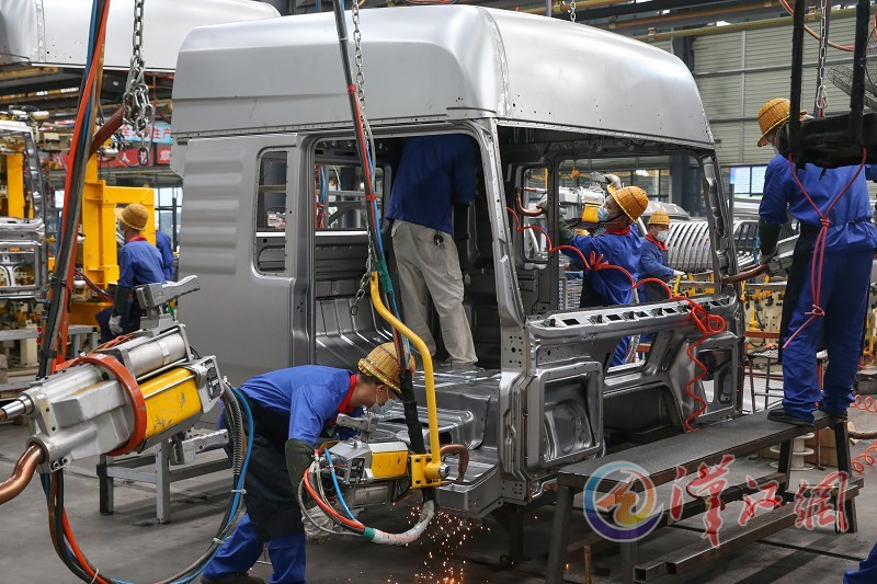 7月9日,湖北新富车身股份有限公司高端重卡车身智能化生产线正紧张生产。