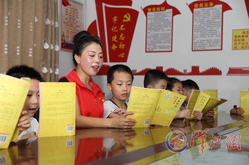 8月4日,在大庆西路社区,志愿者带领小朋友诵读国学经典。