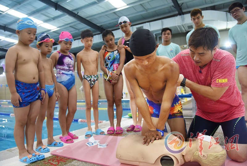 8月8日,市游泳队教练员在襄城区旱鸭子水上运动馆教授防溺水知识。当日,旱鸭子水上运动馆联合市游泳队,邀请市消防支队教员、部分社区工作者及小学,举行防溺水培训公益活动,呼吁大家珍爱生命、远离溺水。全媒体记者 江旭东 通讯员 赵海洋 张捷频 摄