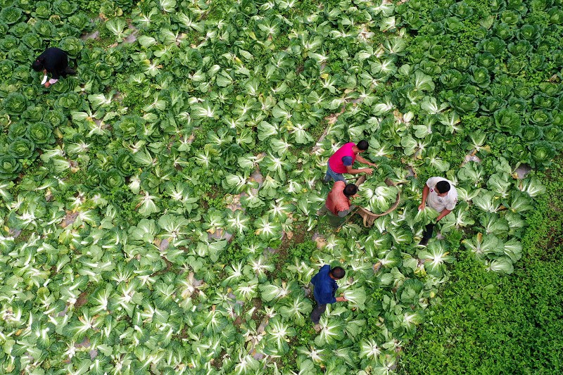 8月18日,在保康县龙坪镇大阳坡村,菜农加紧采摘大白菜等高山反季节蔬菜,田间地头一派丰收景象。